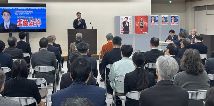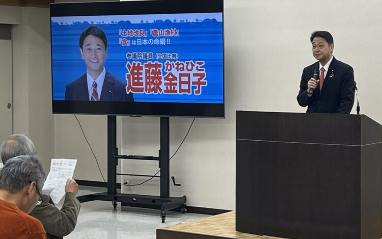 年が明けた1月8日の朝8時過ぎに、進藤金日子参議院議員が本会に新年のあいさつに来訪し、本会の藤原忠彦会長を始め長野市近隣の土地改良区役職員など60名程と新年のあいさつを交わした。